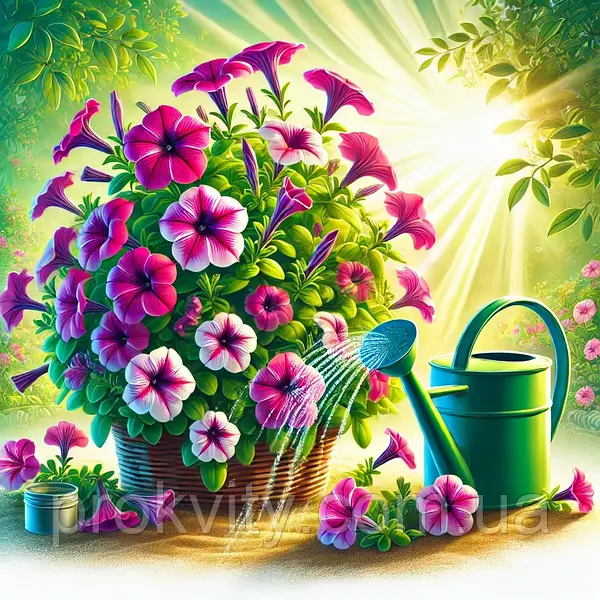 Правильний полив для петунії: Поливайте коли верхній шар землі підсохне. Використовуйте теплу воду – від холодної можуть загнивати корінці.