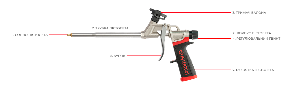 Повторне використання: Гострим ножем видалити з кінця стовбура пістолета затверділу піну. Відкрутити регулювальний гвинт і випустити піну доти, поки потік піни не буде нормальним. Пістолет готовий до подальшого використання.