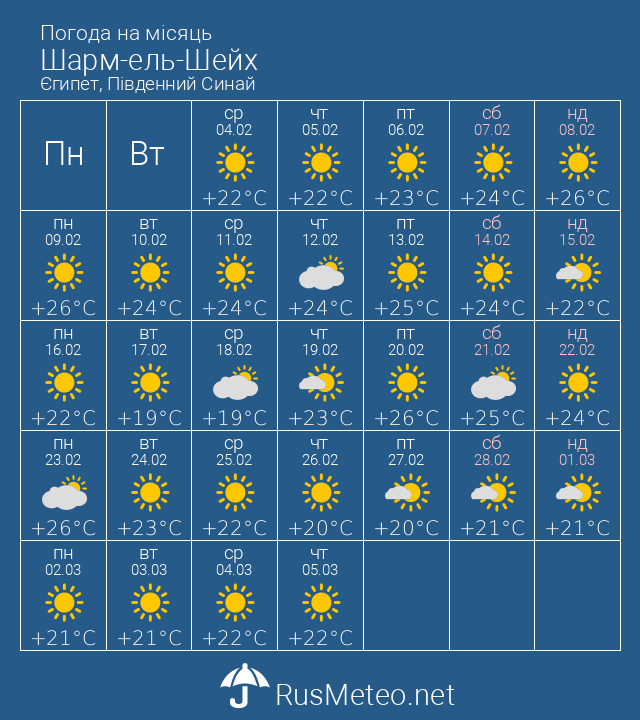 Шарм-ель-Шейх — вдень +22, вночі +17. Каїр — вдень +20, вночі +13.