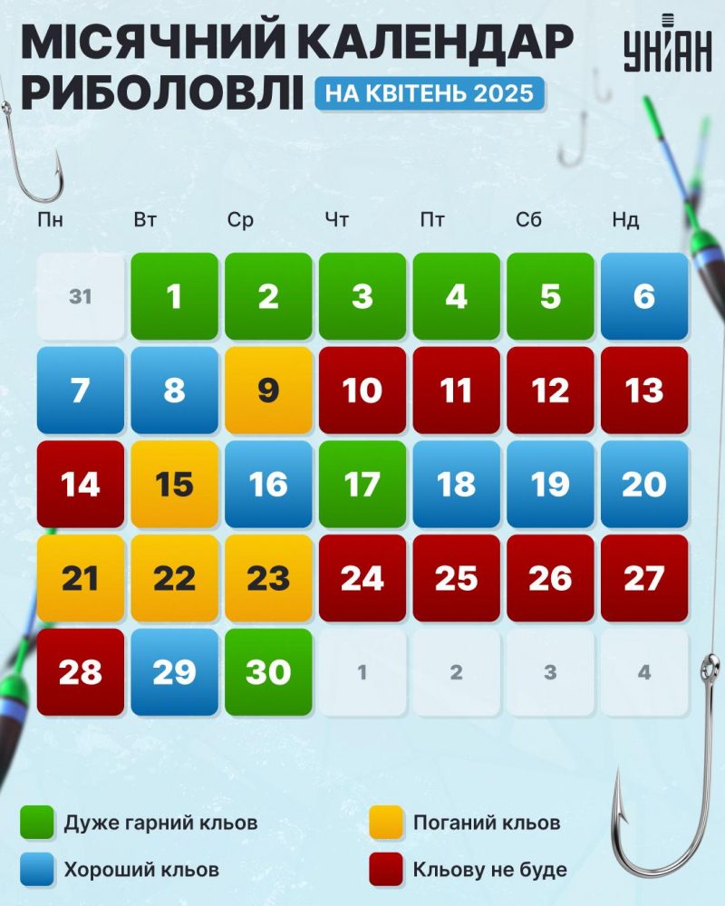 сприятливі дні для риболовлі – 1, 2, 3, 4, 5, 17, 30 квітня, кльов буде дуже активним; · гарний кльов риби – 6, 7, 8, 16, 18, 19, 20, 29 квітня, …