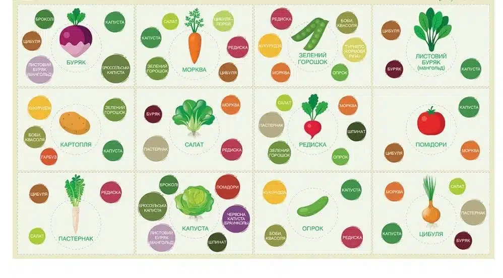 Якщо по краях грядок садити кропиву, валеріану, деревію, рослини ростуть більш здорові та стійкі. Усі селери (морква, пастернак, петрушка, селера) добре поєднуються з цибулевими (часник, цибуля, цибуля-порей, цибуля шалот) До капусти – кріп, шавлія, чебрець залучать корисних комах