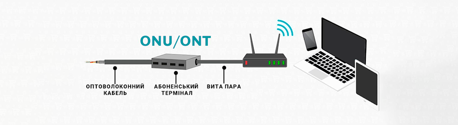 Для переключення на GPON потрібно замінити мідний Інтернет-кабель, який «входить» у Вашу квартиру (найчастіше – з під`їзду), на оптичний. Він буде підключений до оптичного термінала, а вже до нього – Ваш роутер. Щоб Інтернет був навіть при відключенні світла, терміналу та роутеру потрібне резервне електроживлення.