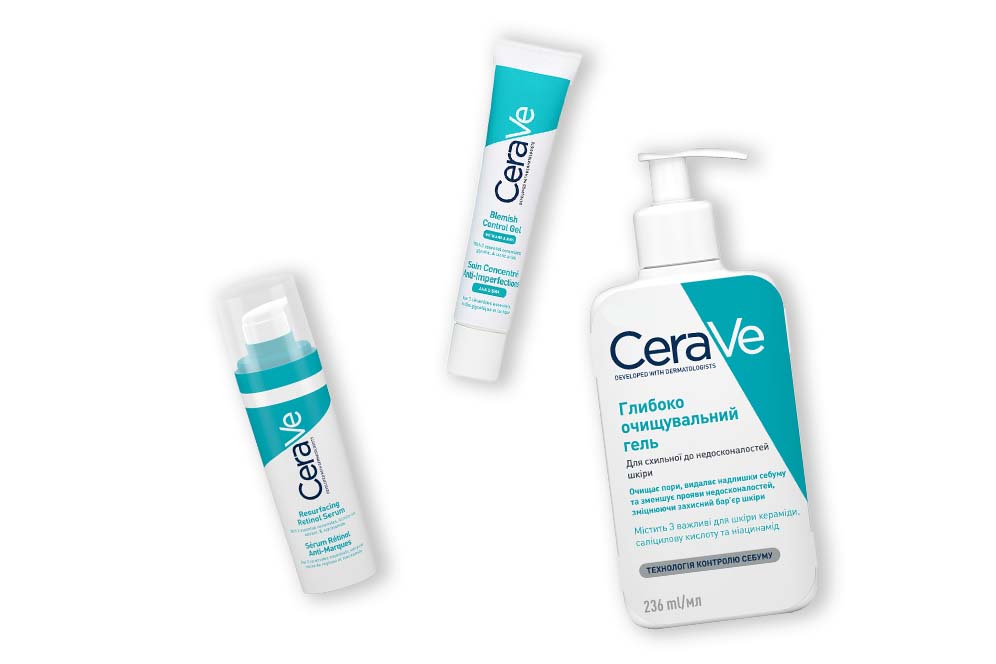 Продукти CeraVe для шкіри, схильної до акне. Сприяють рівному тону обличчя без сухості й лущення та підтримують шкірний бар’єр за допомогою керамідів.