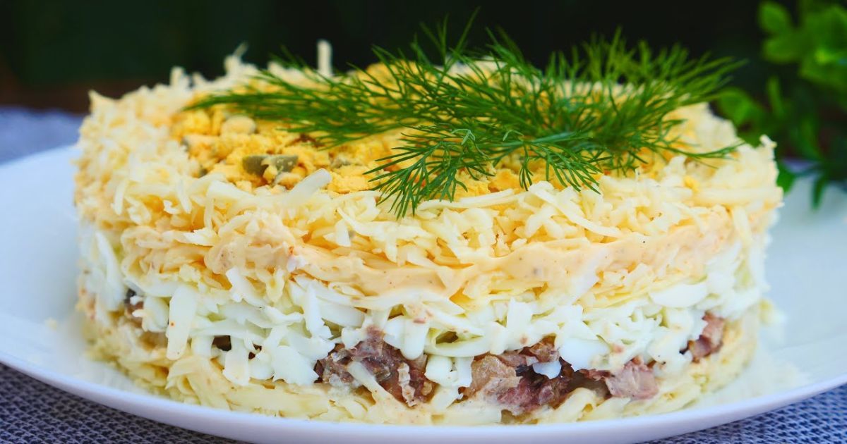 Складається з консервованої риби (горбуша, сайра, сардина), варених яєць, цибулі, сиру та майонезу.